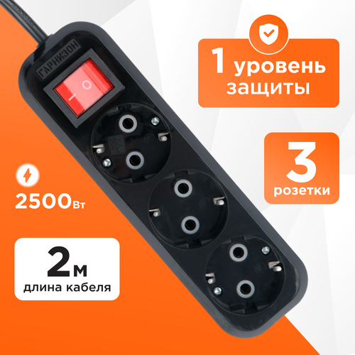 Удлинитель Гарнизон черный 10А 2м с выключателем и заземлением 1 уровень защиты EPB-G3-B-2