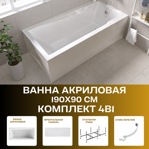 Ванна акриловая 180х80 см RAGUZA комплект 4в1: Прямоугольная ванна, фронтальная панель, каркас, слив-перелив 01ра1880кп