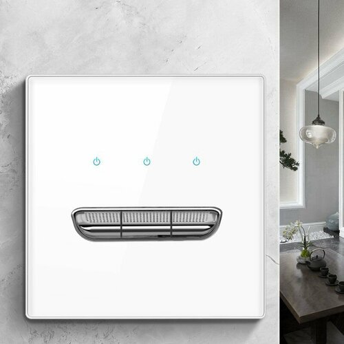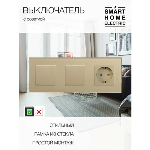 Механический выключатель с розеткой, рамка из стекла, 3 поста (1кл.+1кл.+1роз.)