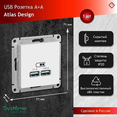 Розетка USB A+A (5В/2,1А 2х5В/1,05А) Белый, Systeme Electric AtlasDesign