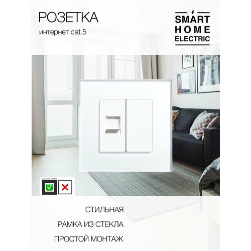 Розетка, на 1 пост, со стеклянной рамкой (Интернет RJ-45) белая