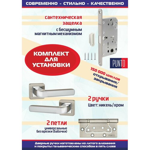 Дверная ручка NOVA QR SN/CP-3 матовый никель/хром Punto (Пунто) с защелкой магнитной ML-50 и 2 универсальные петли без врезки 2B (бабочки)