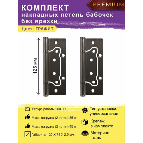 Дверные петли накладные PUNTO (Пунто) бабочки (без врезки) цвет графит для межкомнатных дверей комплект 2 шт (универсальные навесы 125 мм)