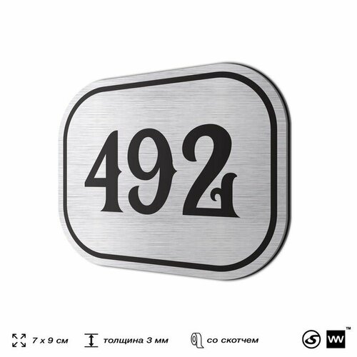 Номерок на дверь квартиры 492, для кабинета, офиса, шильдик 9 х 7 см, брашированная сталь, Айдентика Технолоджи