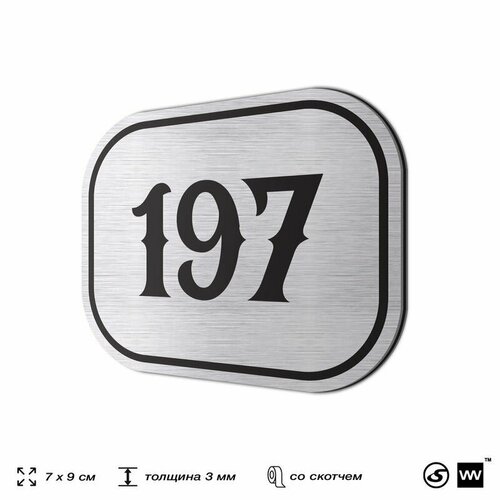 Номерок на дверь квартиры 197, для кабинета, офиса, шильдик 9 х 7 см, серебристый, Айдентика Технолоджи