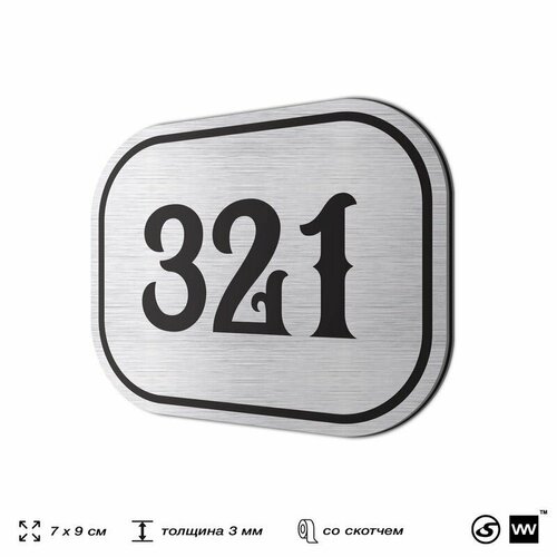 Номерок на дверь квартиры 321, для кабинета, офиса, шильдик 9 х 7 см, брашированная сталь, Айдентика Технолоджи