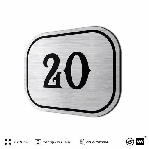 Номерок на дверь квартиры 20, для кабинета, офиса, шильдик 9 х 7 см, серебристый, Айдентика Технолоджи