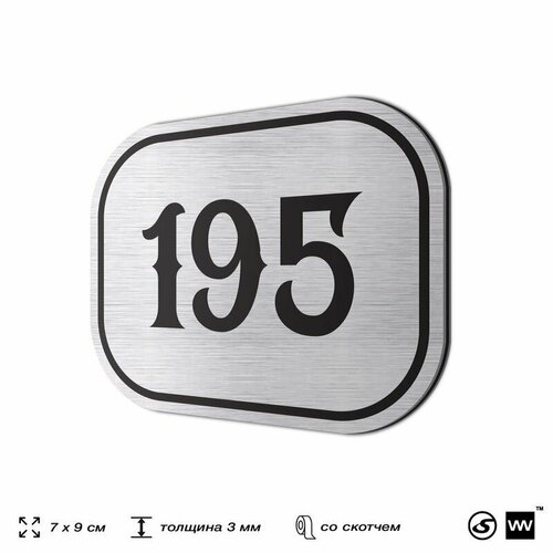 Номерок на дверь квартиры 195, для кабинета, офиса, шильдик 9 х 7 см, серебристый, Айдентика Технолоджи