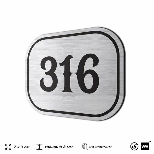 Номерок на дверь квартиры 316, для кабинета, офиса, шильдик 9 х 7 см, брашированная сталь, Айдентика Технолоджи