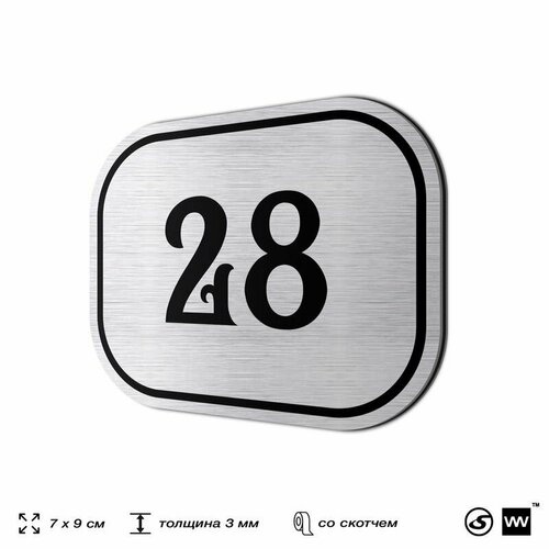 Номерок на дверь квартиры 28, для кабинета, офиса, шильдик 9 х 7 см, серебристый, Айдентика Технолоджи