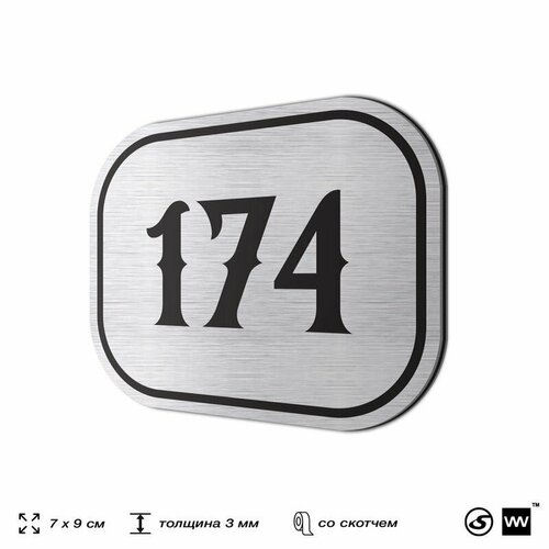 Номерок на дверь квартиры 174, для кабинета, офиса, шильдик 9 х 7 см, серебристый, Айдентика Технолоджи