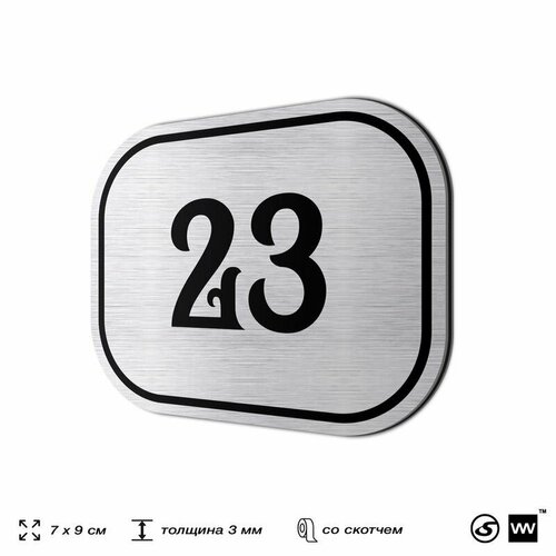 Номерок на дверь квартиры 23, для кабинета, офиса, шильдик 9 х 7 см, серебристый, Айдентика Технолоджи