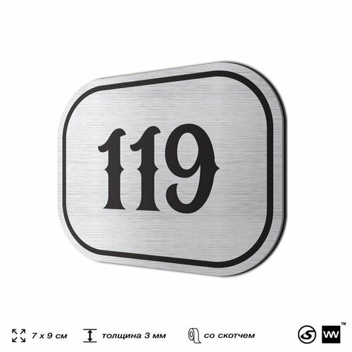 Номерок на дверь квартиры 119, для кабинета, офиса, шильдик 9 х 7 см, серебристый, Айдентика Технолоджи