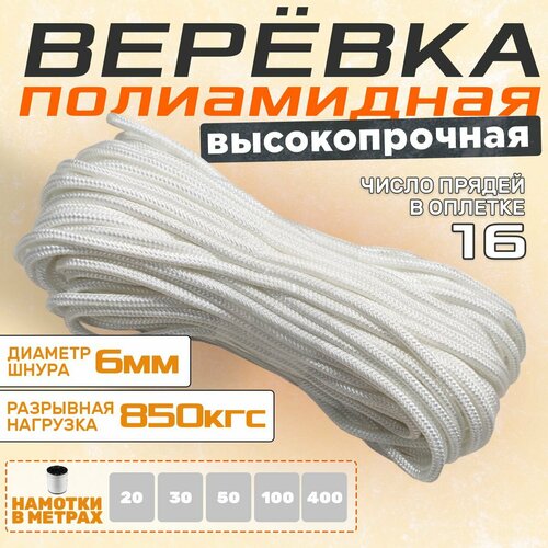 Веревка "Статика", полиамид, диаметр 6мм, длина 400 метров, белая, разрывная нагрузка 850 кгс