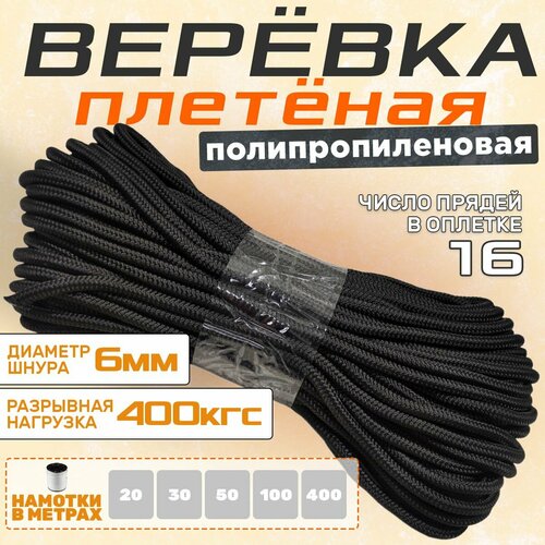 Веревка полипропиленовая, диаметр 6 мм, длина 50 метров, чёрная