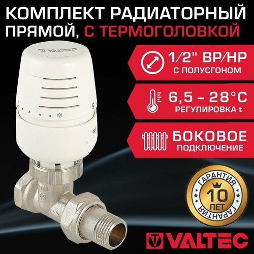 Комплект терморегулирующий прямой 1/2" ВР-НР VALTEC для подключения радиатора отопления: радиаторный клапан VT.032. N.04 и термоголовка VT.5000.0.0