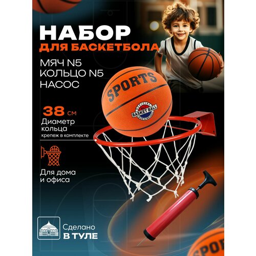 Кольцо баскетбольное №5 с сеткой, 38 см, мяч баскетбольный, насос для мяча красный
