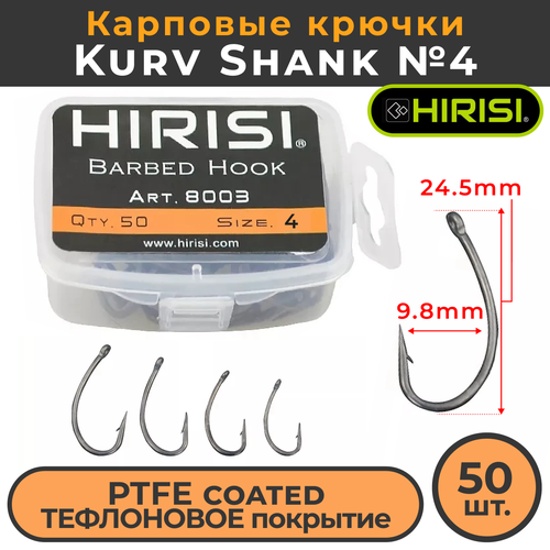 Крючки карповые Kurv Shank 50 шт. (8003 размер 4) из высокоуглеродистой нержавеющей стали с тефлоновым покрытием для ловли карпа