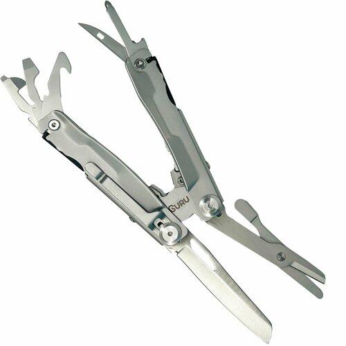 серыйМультифункциональный нож Guru Termit - в комплекте идёт нож из стали 420, пила по металлу и дереву, ножницы, стеклобой на торце корпуса ножа. Лёгкий доступ ко всем инструментам, мультифункциональный нож Guru Termit выполнен из нержавеющей стали, отлично лежит в руке. Лезвие ножа, пилы и открывашки надежно зафиксированы предохранителем в рабочем состоянии, что не позволяет мему закрыться и поранить пальцы владельца. Надёжная клипса для ношения на ремне и красивый подарочный мешочек в наборе. Количество инструментов: 6