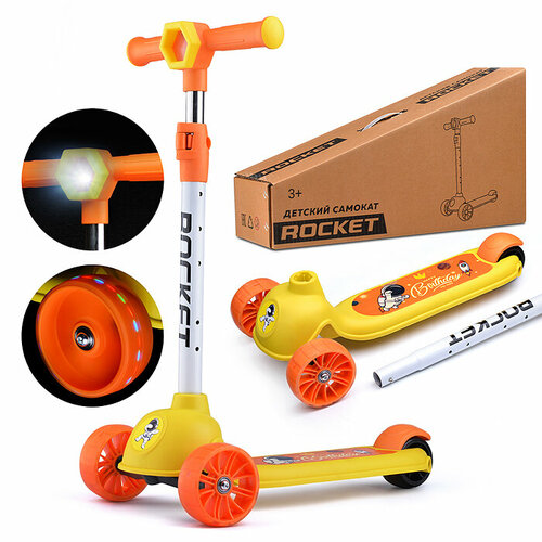 Самокат трёхколёсный ROCKET колёса световые PU, цвет желтый