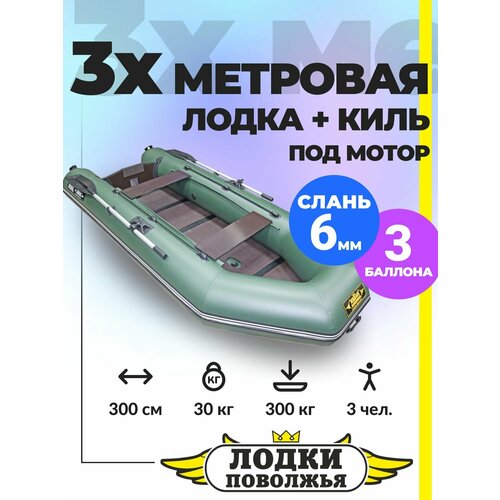 Лодка надувная ПВХ под мотор Муссон 300 СК Лайт с жёстким полом и килем для рыбалки, зеленая