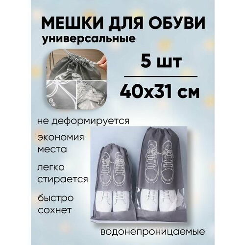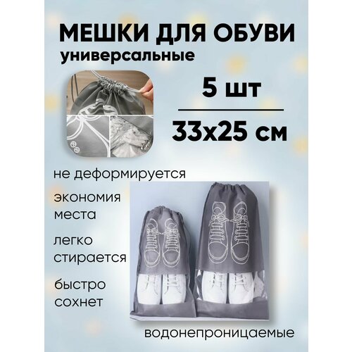 Мешки для обуви 5 штук, 33 х 25 см, серые