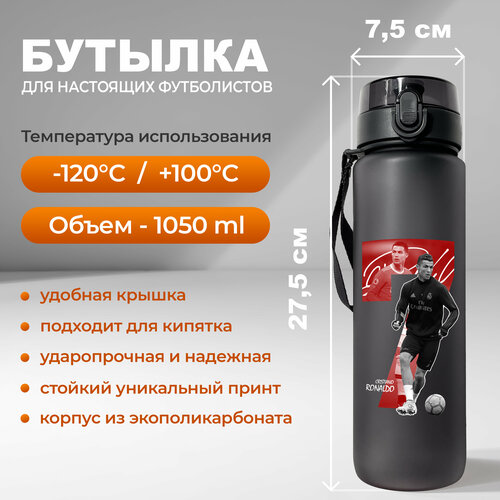 Спортивная бутылка для воды Aika "Футбол" с изображением Cristiano Ronaldo (Криштиану Роналду), объемом 1050 мл, черного цвета