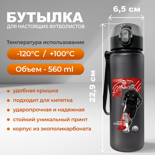Спортивная бутылка для воды Aika "Футбол" с изображением Cristiano Ronaldo (Криштиану Роналду), объемом 560 мл, черного цвета