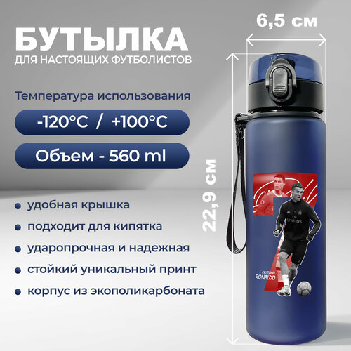 Спортивная бутылка для воды Aika "Футбол" с изображением Cristiano Ronaldo (Криштиану Роналду), объемом 560 мл, синего цвета