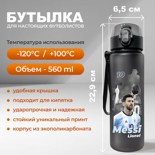 Спортивная бутылка для воды Aika "Футбол" с изображением Lionel Messi, объемом 560 мл, черного цвета