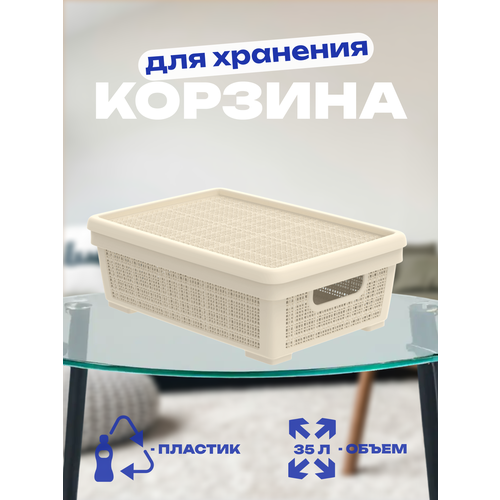 Корзина плетёная для хранения с крышкой «Лён» 35л (568×400×203мм) слоновая кость, арт. АП 453