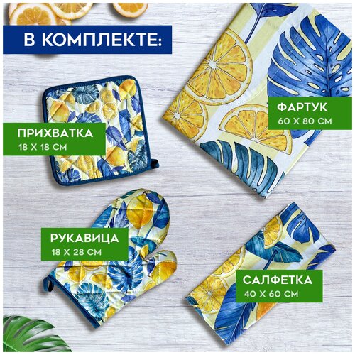 Набор для кухни 4 в 1, хлопок, (прихватка 18х18, прихватка-рукавица 18х28, фартук 60х80 см, салфетка 40х60 см), бело-синий с лимоном (23)