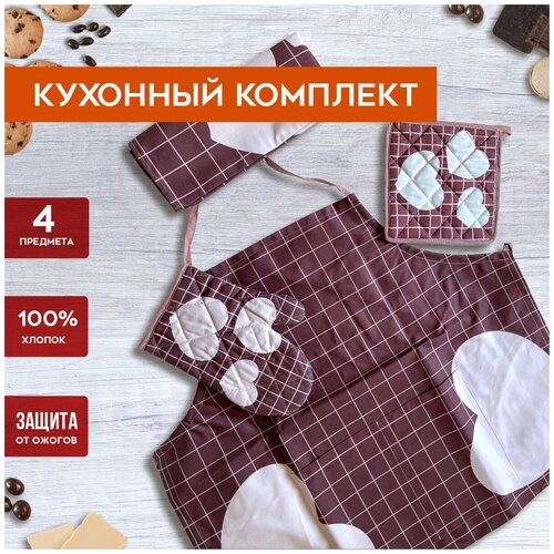 Набор для кухни 4 в 1, хлопок, (прихватка 18х18, прихватка-рукавица 18х28, фартук 60х80 см, салфетка 40х60 см), коричневый с сердечками (21)