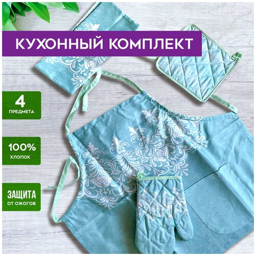 Набор для кухни 4 в 1, хлопок, (прихватка 18х18, прихватка-рукавица 18х28, фартук 60х80 см, салфетка 40х60 см), бирюзовый с орнаментом (19)