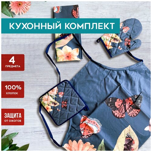 Набор для кухни 4 в 1, хлопок, (прихватка 18х18, прихватка-рукавица 18х28, фартук 60х80 см, салфетка 40х60 см), темно-серый с бабочкой (25)