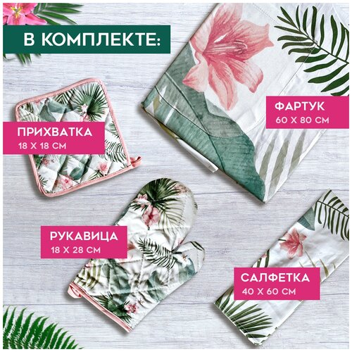 Набор для кухни 4 в 1, хлопок, (прихватка 18х18, прихватка-рукавица 18х28, фартук 60х80 см, салфетка 40х60 см), с лилиями (24)