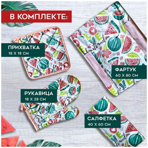 Набор для кухни 4 в 1, хлопок, (прихватка 18х18, прихватка-рукавица 18х28, фартук 60х80 см, салфетка 40х60 см), с арбузными дольками (22)