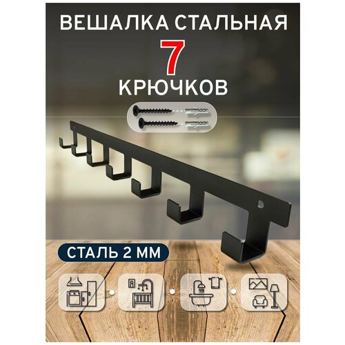 Вешалка для одежды настенная черная, на 9 крючков / крючок настенный для ванной
