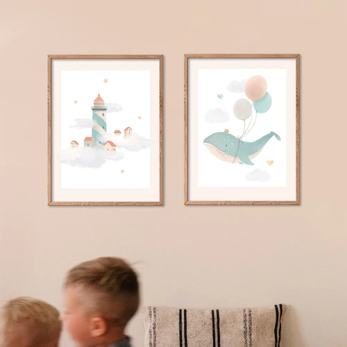 Набор интерьерных постеров в детскую Кит и Маяк / бежевый 30х40, 2шт.