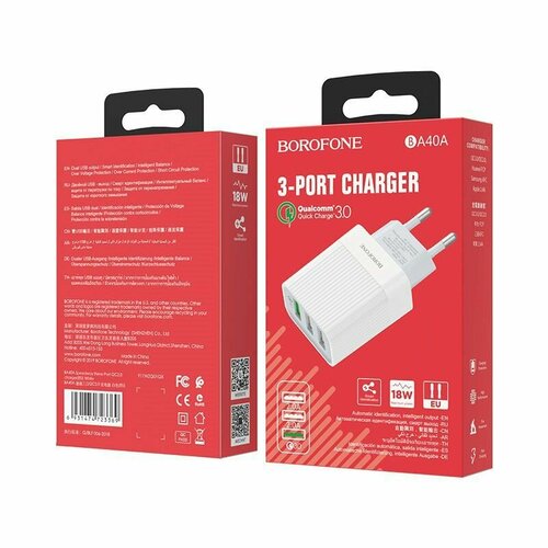 Зарядное устройство BOROFONE BA40A / 3xUSB / 1 выход с быстрой зарядкой QC3.0/18W + 2 выхода по 2A / белое