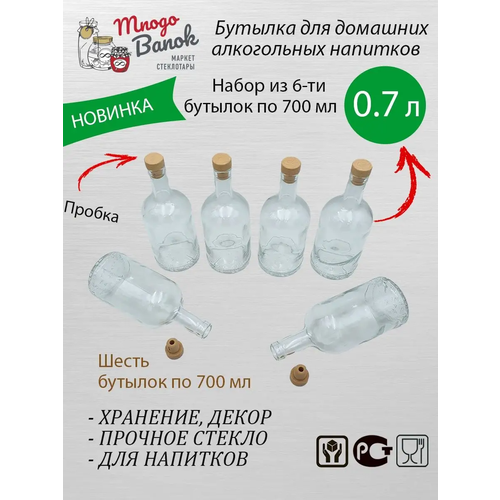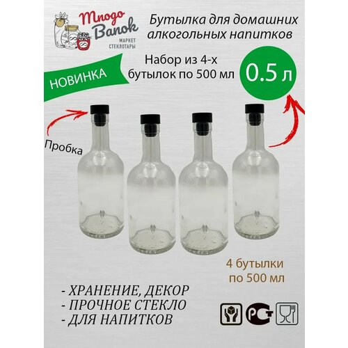 Бутылка стеклянная 0,5 литра Bottiglia Country Home / Набор: 4 бутылки 500мл и 4 черные пробки / Для домашних настоек, самогона, водки, ликеров и других алкогольных напитков