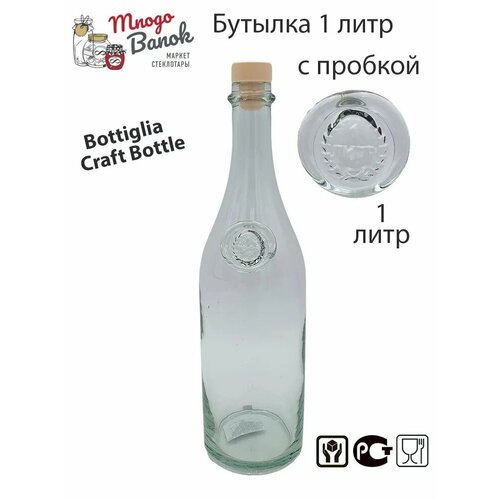Бутылка стеклянная 1л / Бутыль 1000 мл из прозрачного стекла Bottiglia Craft Bottle с печатью "1 литр" для воды, сока, вина, самогона, настоек, компота