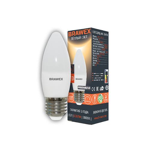 Упаковка светодиодных ламп BRAWEX свеча 7Вт 3000К B35 Е27 0707E-B35-7L (10шт)