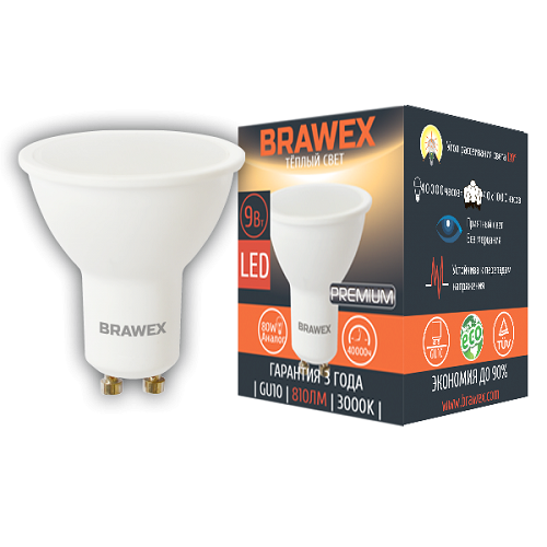 Упаковка ветодиодных лама BRAWEX 9Вт 3000К PAR16 GU10 4107J-PAR16k1-9L (10 шт)