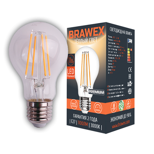 Упаковка светодиодных ламп Brawex LED Filament A60 11W 3000K A60F-E27-11L (5шт)
