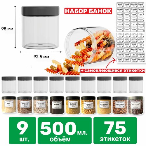 Банка для сыпучих продуктов, круп, специй, чая, универсальные, 9 шт, 500 мл. 75 этикеток с печатью