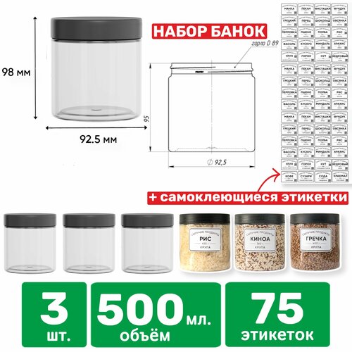 Контейнер для хранения сыпучих круп чая емкости баночки, 3 шт, 500 мл. 75 этикеток с печатью