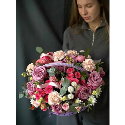 Корзина живых цветов "Малиновые сны" с розами, хризантемой и эустомой размер L 952266469