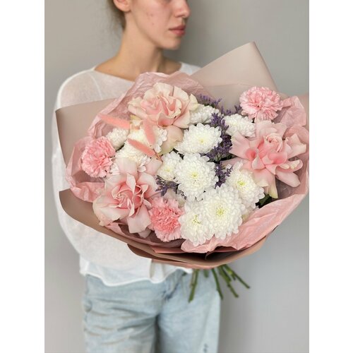 Цветы живые букет с французской розой "Нежное послание" с хризантемой 921218528