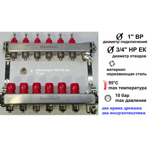 Коллектор регулируемый с расходомерами из нержавеющей стали DanHeat 6 выходов